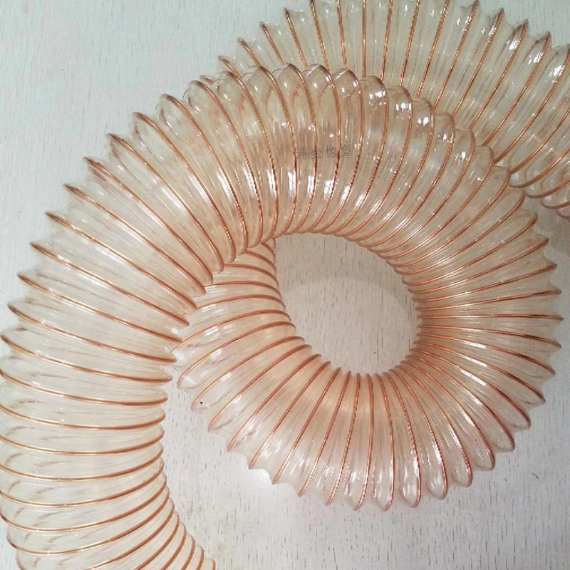 产品用途: 适用于高流动速率有磨损力的颗粒,沙砾,碎石,细粒,木屑,粉尘、纸屑,气体和液体环境,筒仓输送,玻璃业,土木业,钢铁业,塑料业,矿坑,造船业,水泥业等的机械输送用管。性质:抗磨损,镀铜钢丝增强软管耐负压,真空和抗压缩,令输送物质流畅,良好的弯曲性,弯曲半径约等于3倍外径,构造以高弹性镀铜钢丝包覆于管壁,聚醚型—聚氨酯,约0.6-1.5mm壁厚,比普通PVC,橡胶管的耐磨损高3倍以上。